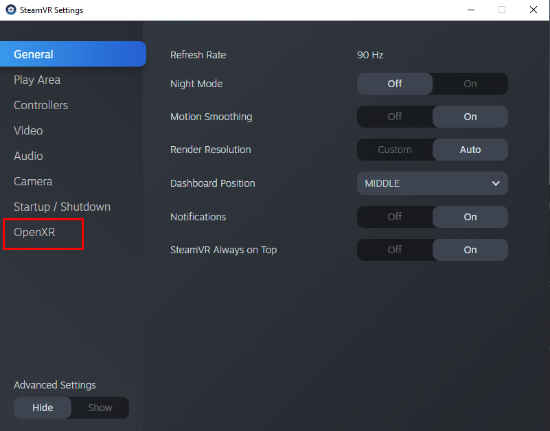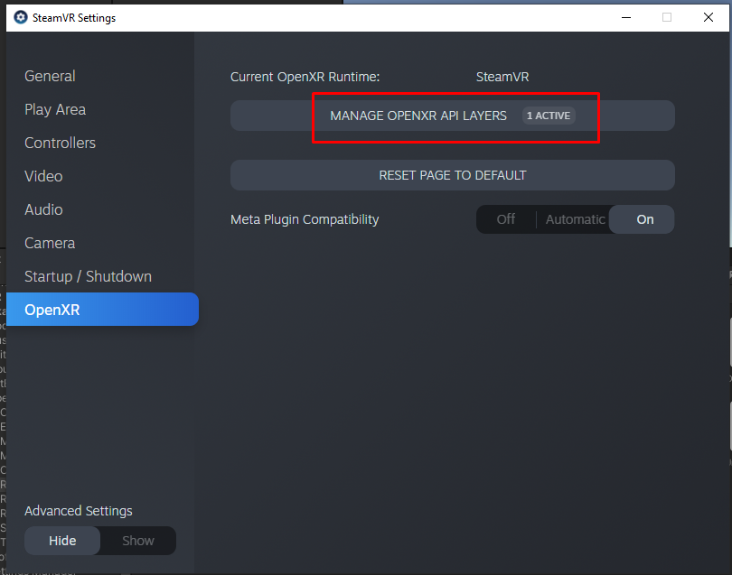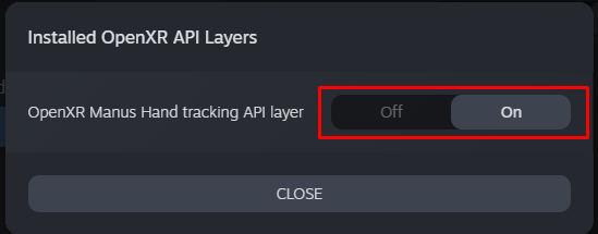 This will show a list of all installed OpenXR API Layers. Using the On and Off switch, the OpenXR Manus Hand tracking API layer
