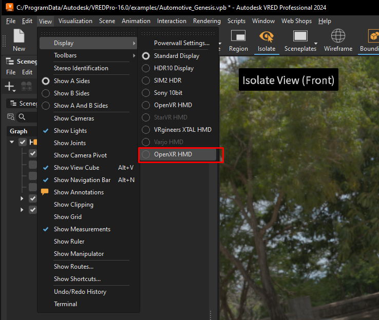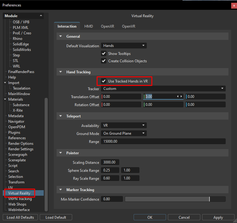 Any changes made to the Virtual Reality preferences in VRED will only be applied when setting the display mode to OpenXR HMD