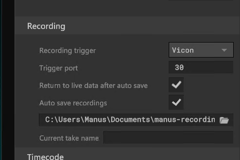 Setup Vicon Shogun Live to broadcast capture and select Vicon as the remote trigger. MANUS Core will then automatically start, stop and save. The recordings will be saved in the capture folder specified in Shogun Live. Make sure the folder specified in Shogun Live actually exists.