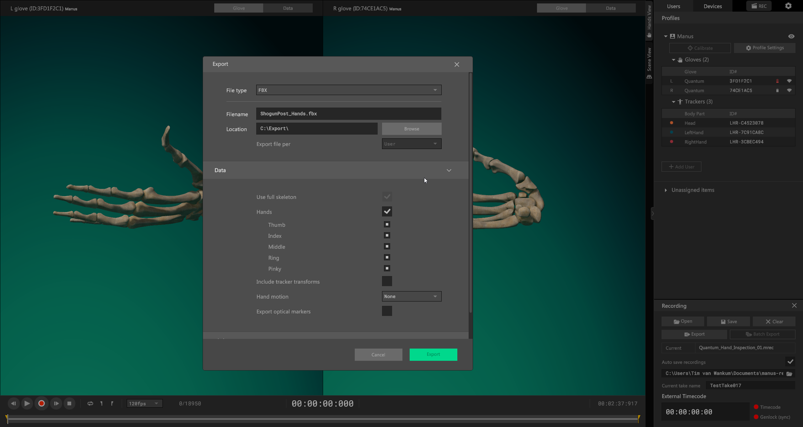 This article will guide you through the proces of capturing en exporting a recording using Shogun Live and Manus Core and merging the hand and body data afterwards in Shogun Post.