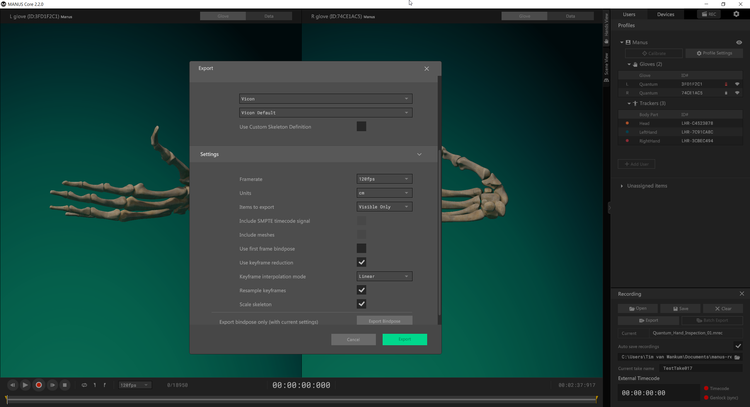 . - Match the export framerate with the Vicon body recording you intend to merge.