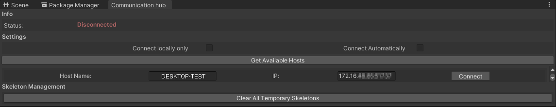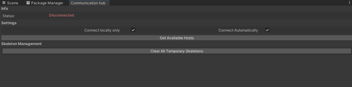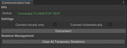 Within the Communication Hub, the plugin is set to automatically connect to MANUS Core instances running on the same machine (locally).