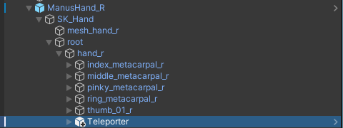 On ManusInteractionHand(L/R) open the hierarchy and navigate to the Teleporter (ManusInteractionHand_L/R->SK_Hand->root->hand_l/r->Teleporter), select it, and in the inspector we can see four fields that need to be filled in: