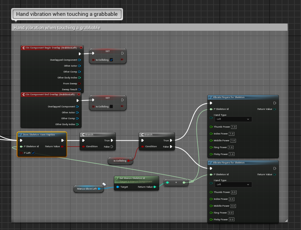The interaction framework supports haptic feedback on MANUS Glove devices that support haptics. If the ManusGlovesPawn