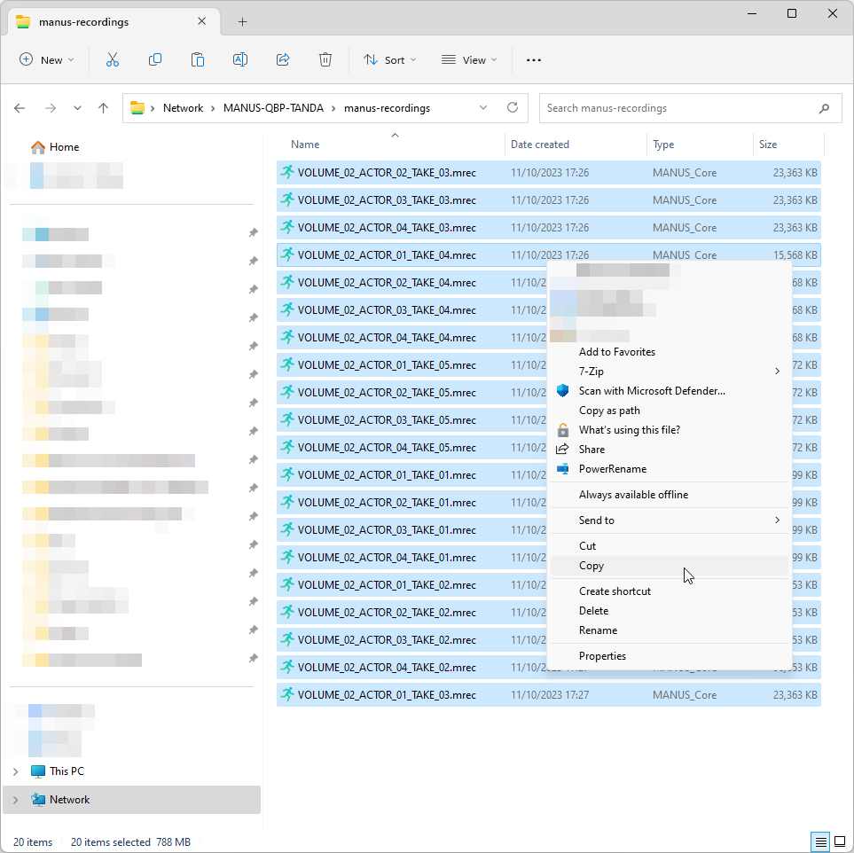 The MANUS Quantum Bodypack has been configured to store recordings locally in a network accessible folder. Depending on your (triggered) recording workflow, recordings will be saved directly on the Bodypack or remotely on another computer.