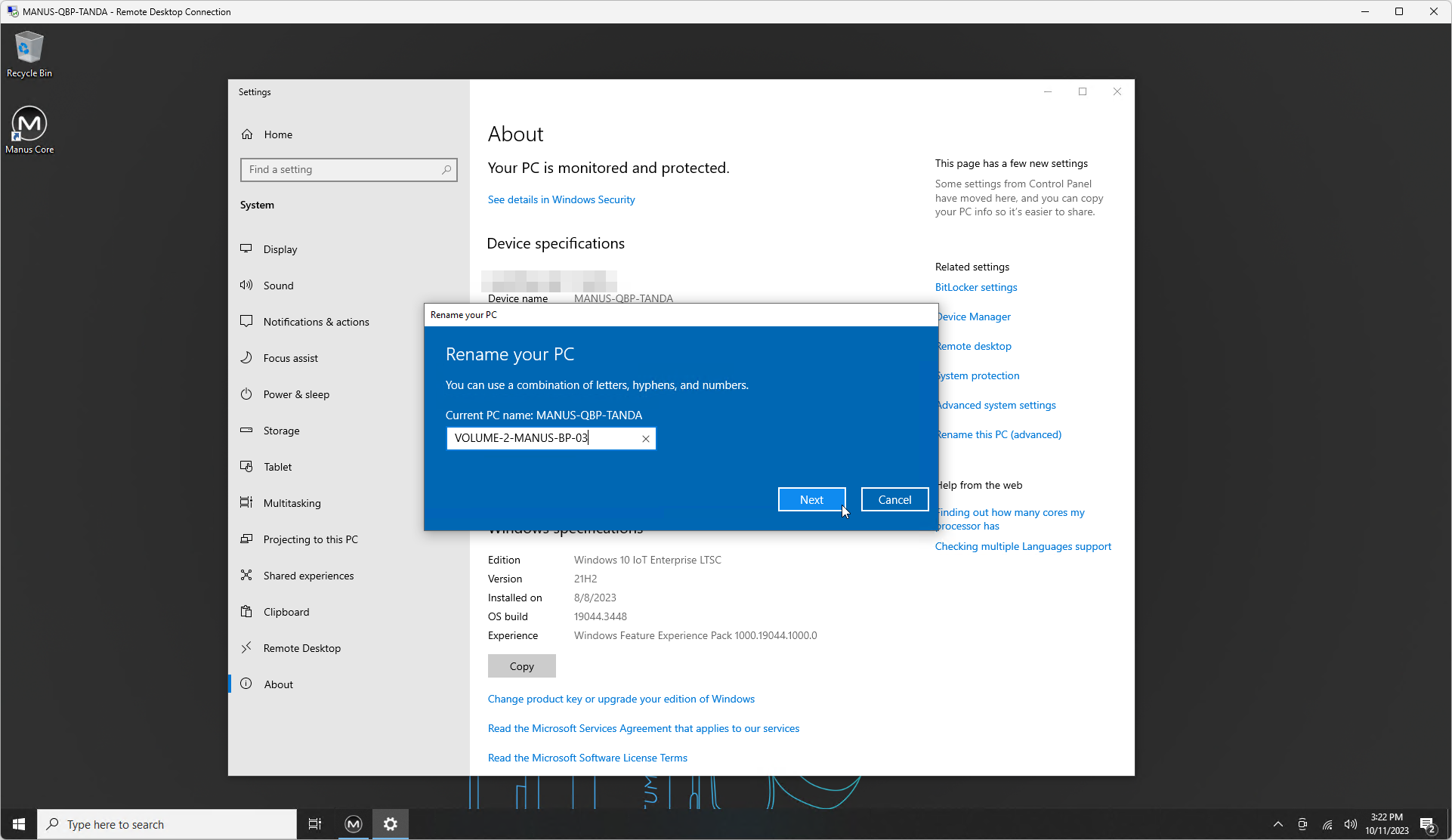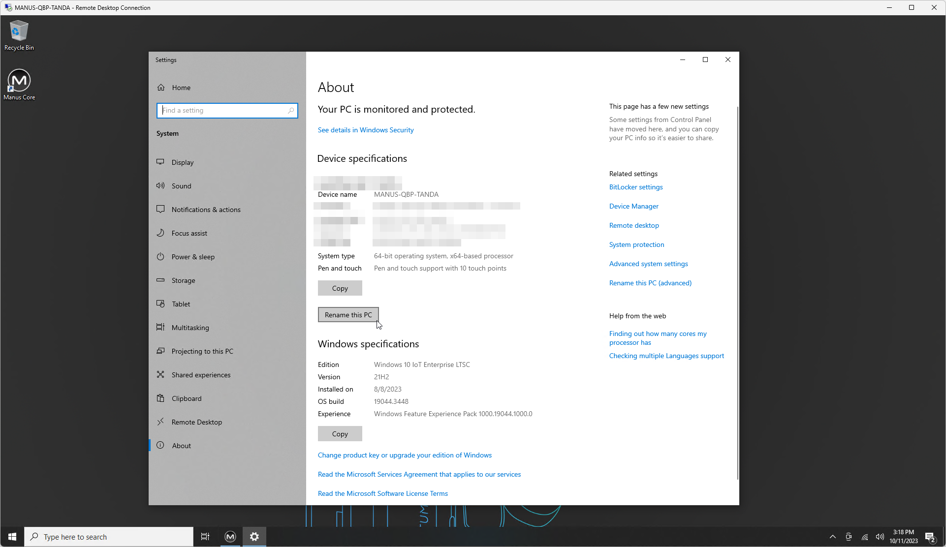 Using the Windows System About settings, you can customize the hostname of your Bodypack by changing your Windows Device name.