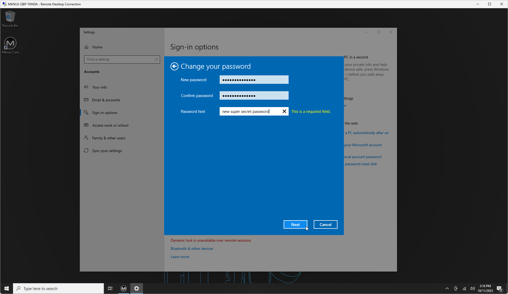 Enter your new unique password twice, enter a password hint, and click "Next":