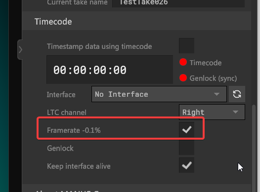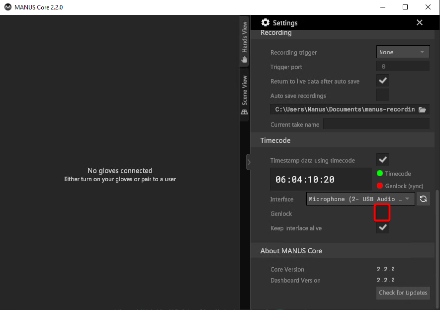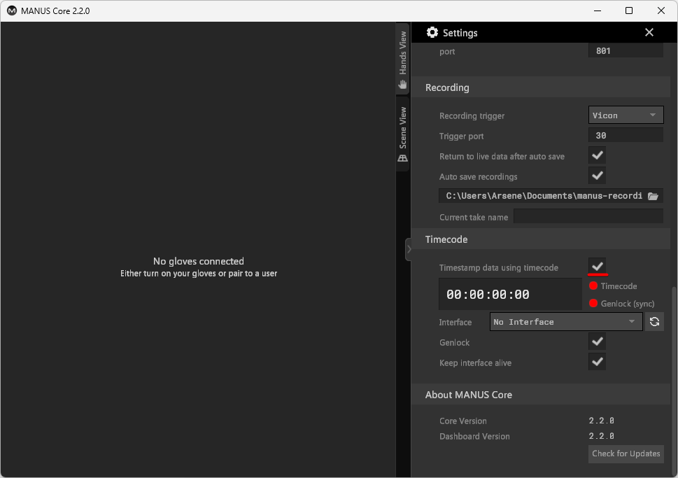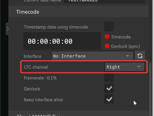 Open the MANUS Core Dashboard "Settings" panel and scroll down to "Timecode":