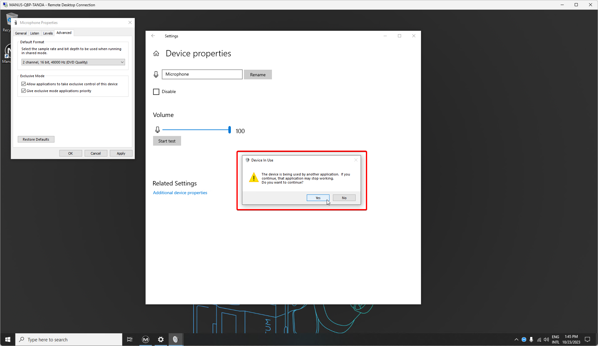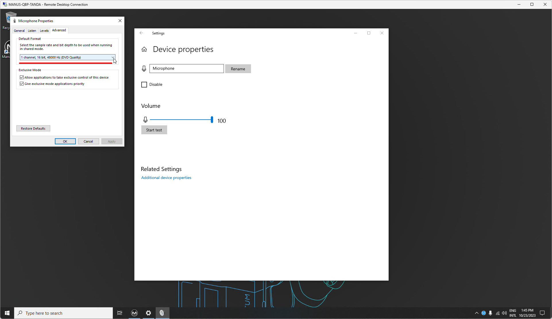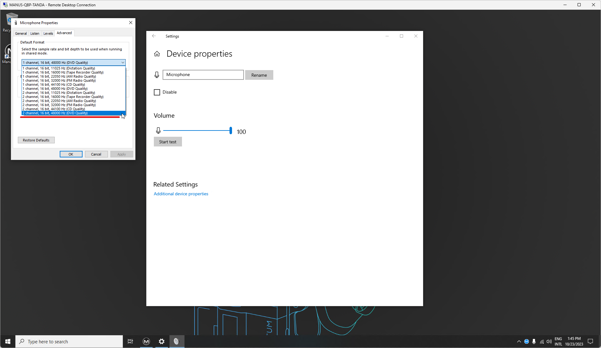 Set the sample rate to "2 channels, 16 bit, 48000 Hz (DVD Quality)":