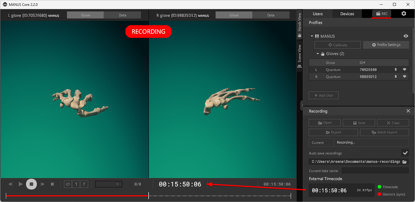 To use timecode and sync, you will need to configure MANUS Core Dashboard.