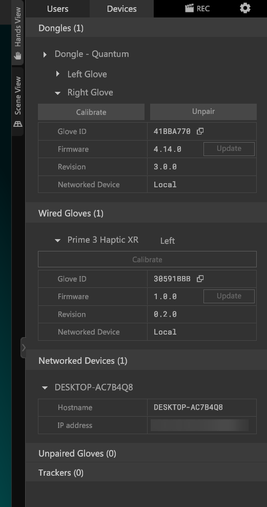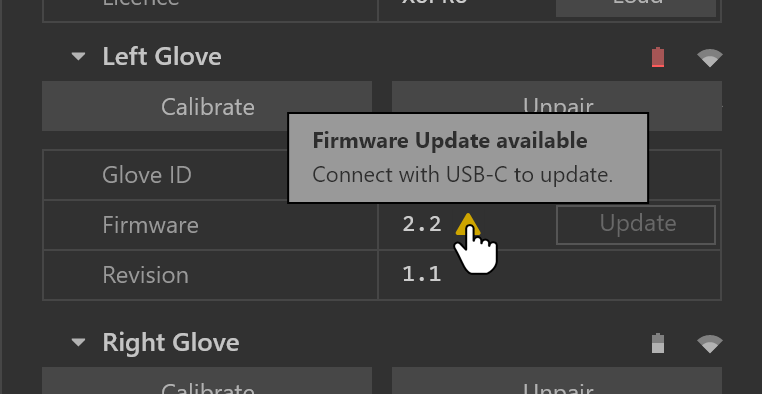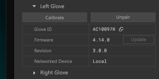 - Firmware: Showing the current version of the firmware installed on the glove. And the ability to update the firmware with the “Update” button when available.