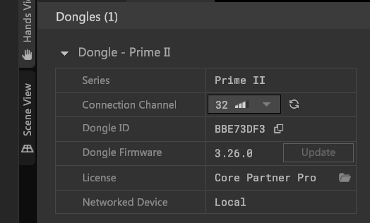 - Dongle ID: A unique identifier for each dongle, mostly used for reference and to communicate with the MANUS Support team when needed. To copy the ID number, simply click the