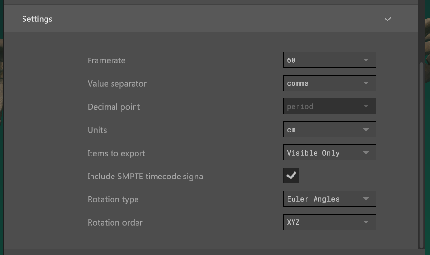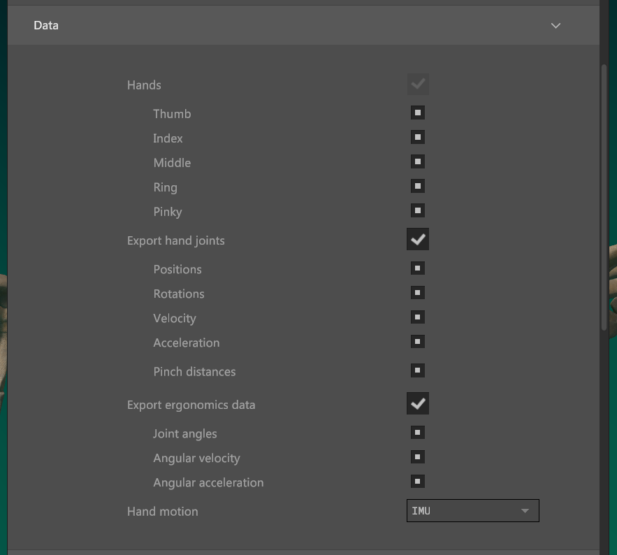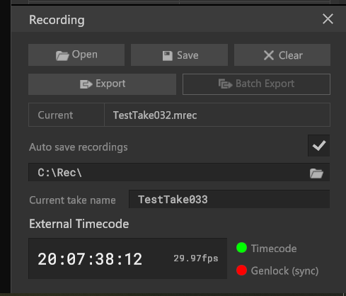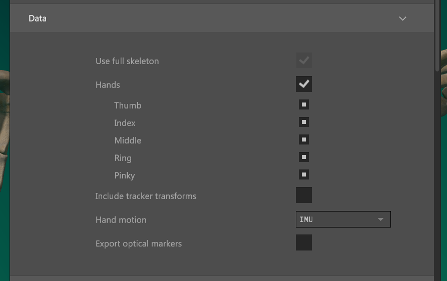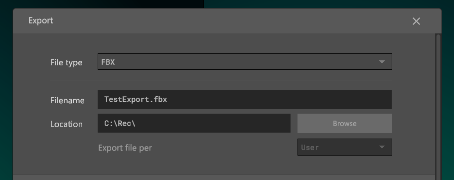 Export your current recording to either fbx or csv for use outside of MANUS Core. The current recording will be exported using the specified in and out points.