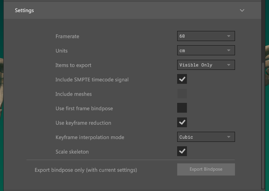 sets if the exported FBX includes the meshes.Use first frame bindpose