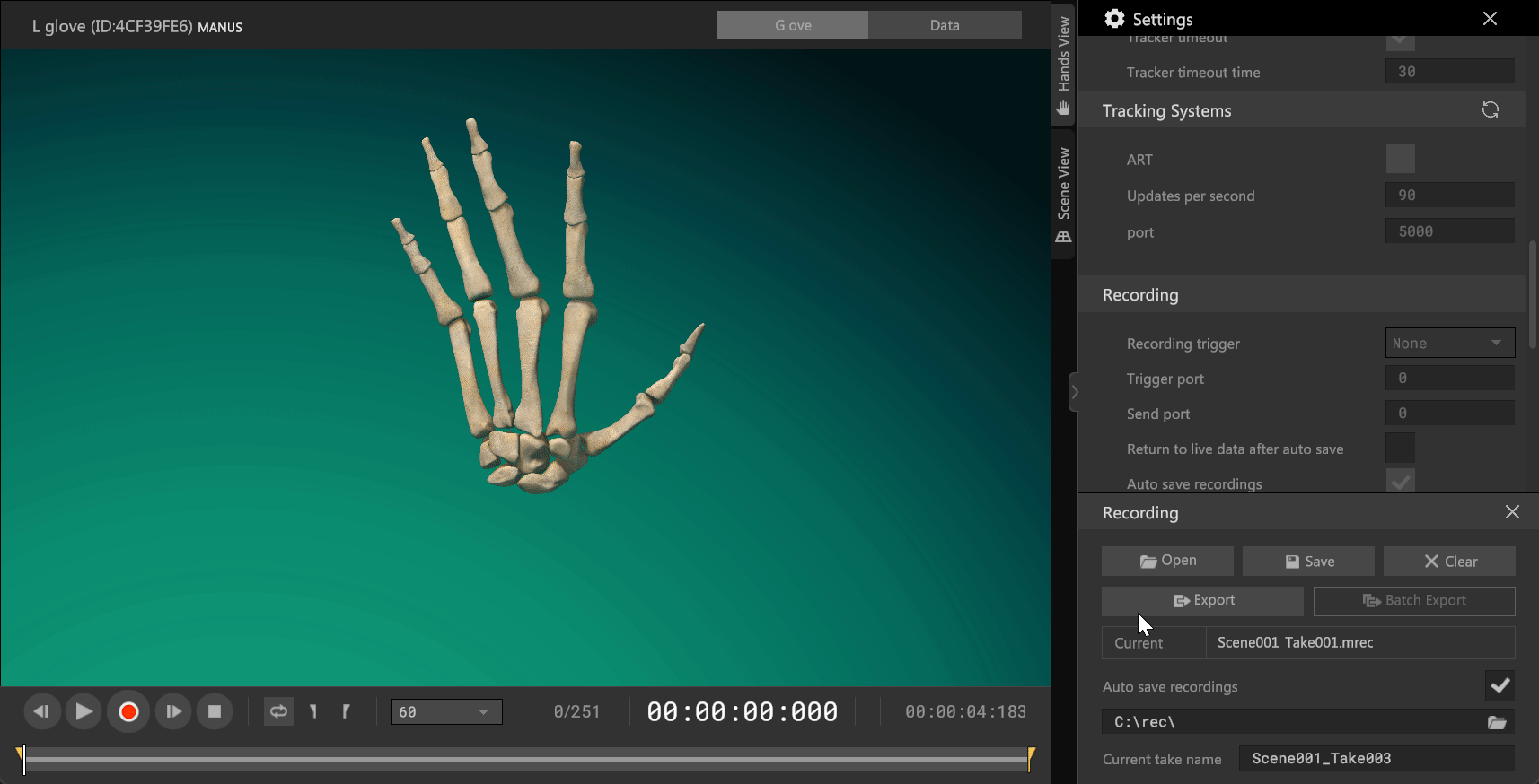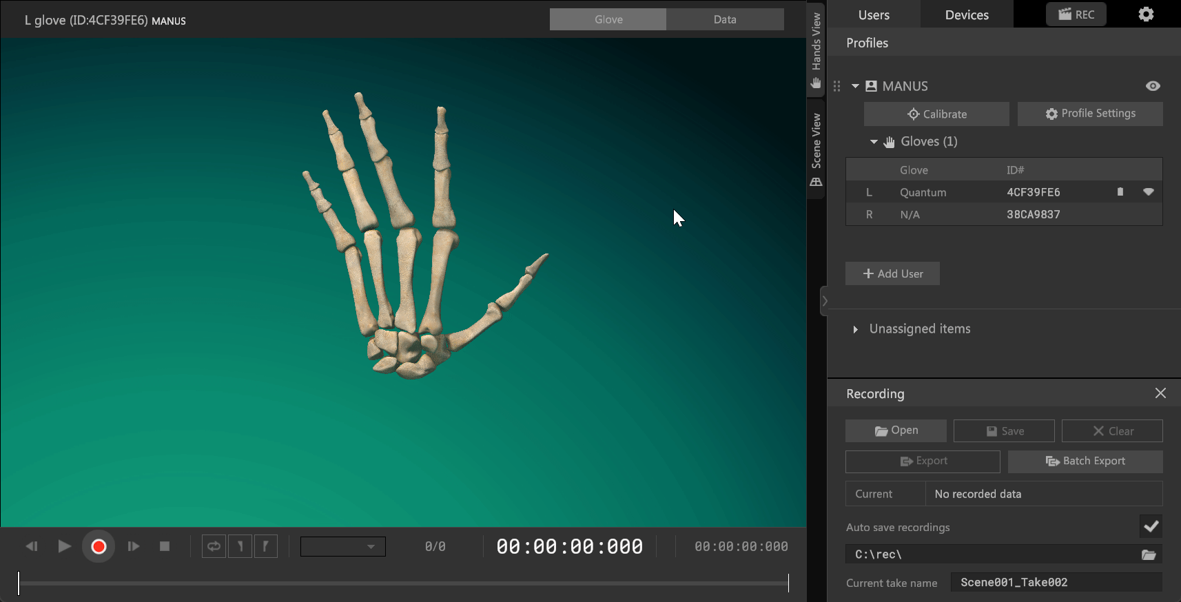 MANUS Core features a recorder to capture, save, export and playback MANUS Core glove and body data. The recorder and exporter are part of MANUS Core Dashboard and can be opened by clicking the REC