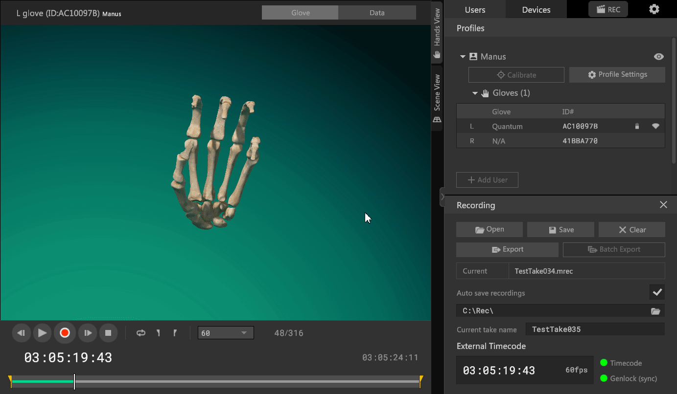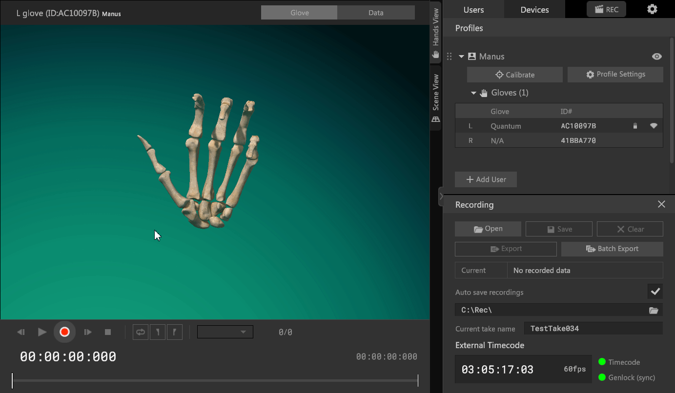 From this point on the data within MANUS Core will be timecoded. When recording using the MANUS recorder, data will be recorded using timecode time.