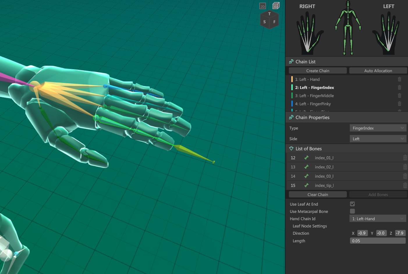 When using glove data to drive the animation of a model, you commonly run into mismatches. Be it, the dimensions of the model don't match, the bone names don't match etcetera. The skeleton system is our answer to tackle that issue. It's a system to retarget our data (be it glove or body) onto the model of your choosing.