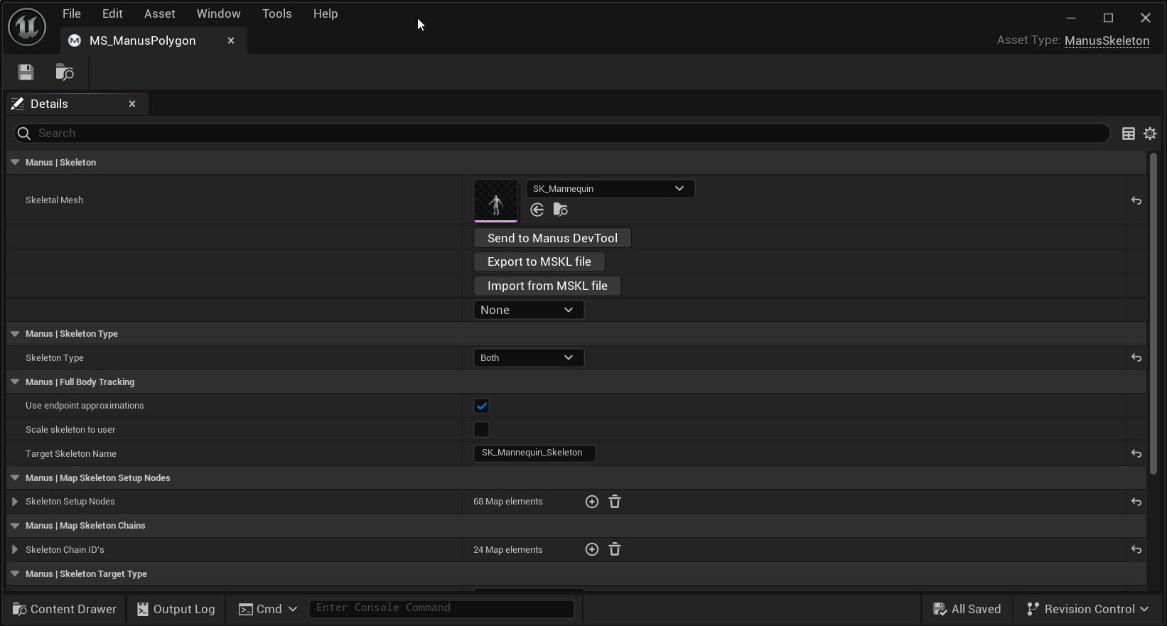 (Manus Skeleton) file format. These files can then be loaded and re-used for models. Opening these files will open the MANUS DevTools for you to edit them, and they can be saved back to mskl