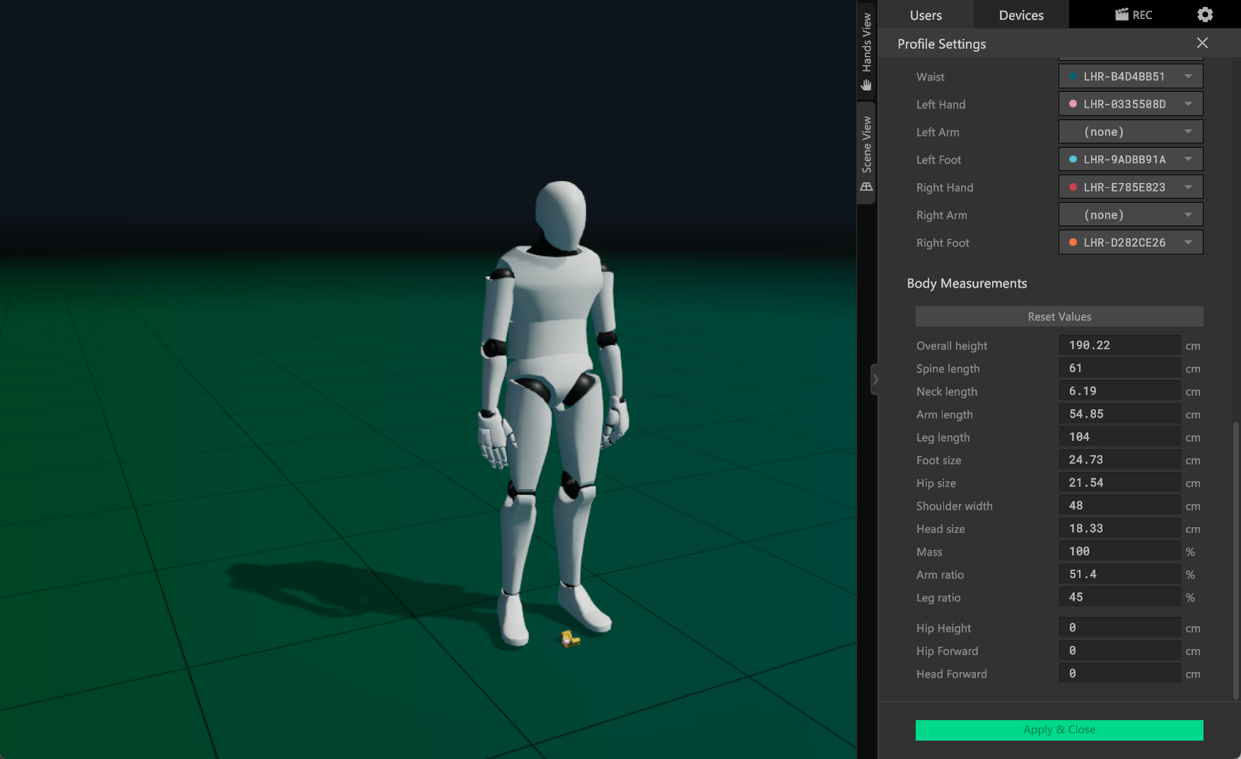 After calibration the results can be visually inspected inside the scene view. The body measurements are displayed inside the profile settings of the user. These can be tweaked to improve the body solve, reset values