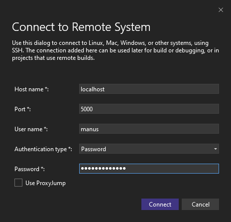 To connect Visual Studio to your remote machine, follow the steps outlined in the official Microsoft documentation. If you have your environment set up through docker, use the machine's ip address as host and 5000 for the port, and for username and password use whatever you replaced them with in the Dockerfile.