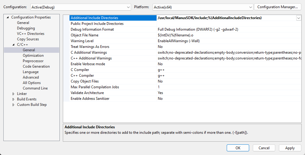 - Add the location of the MANUS headers to C/C++ > General > Additional Include Directories. For example ~/ManusSDK/include