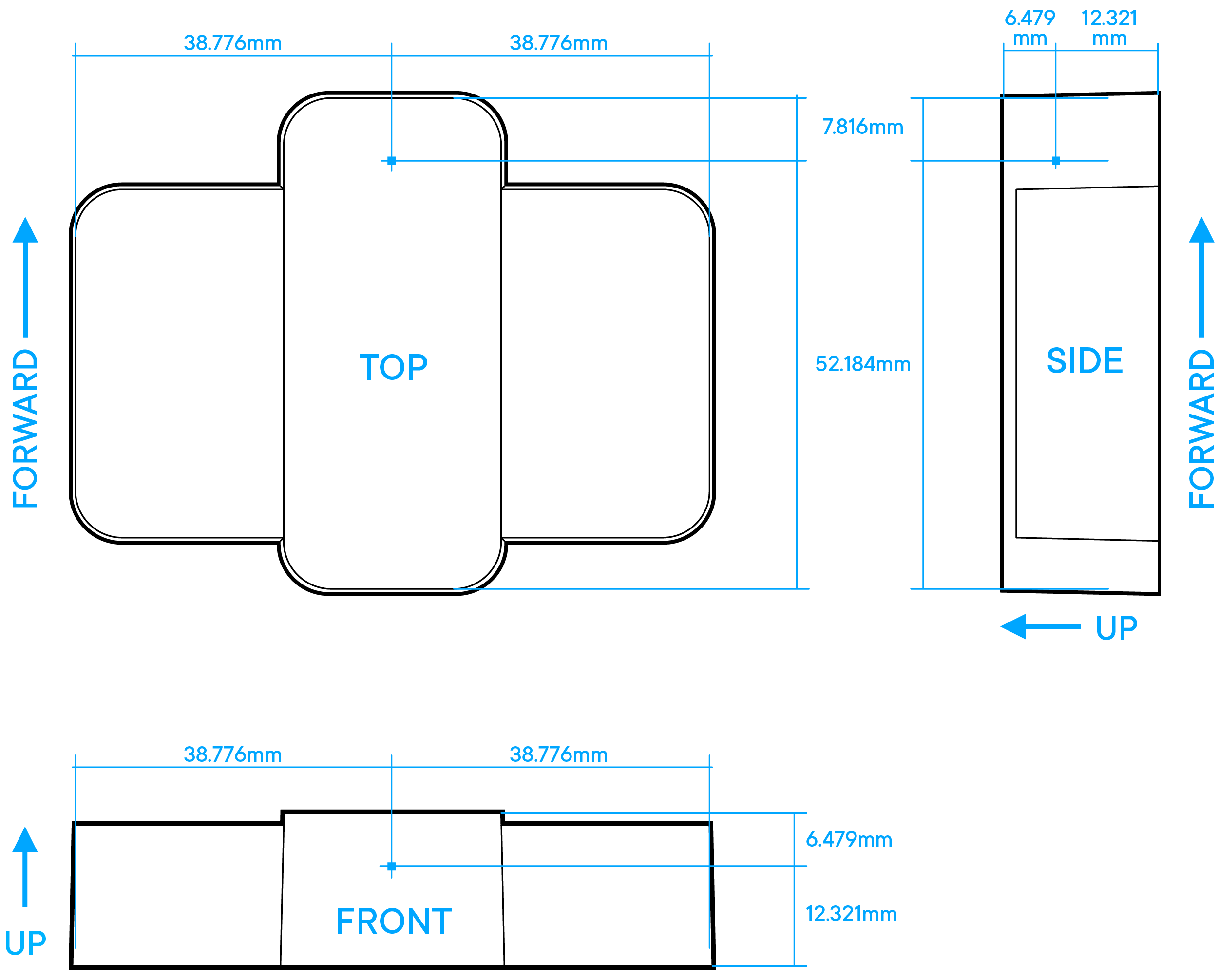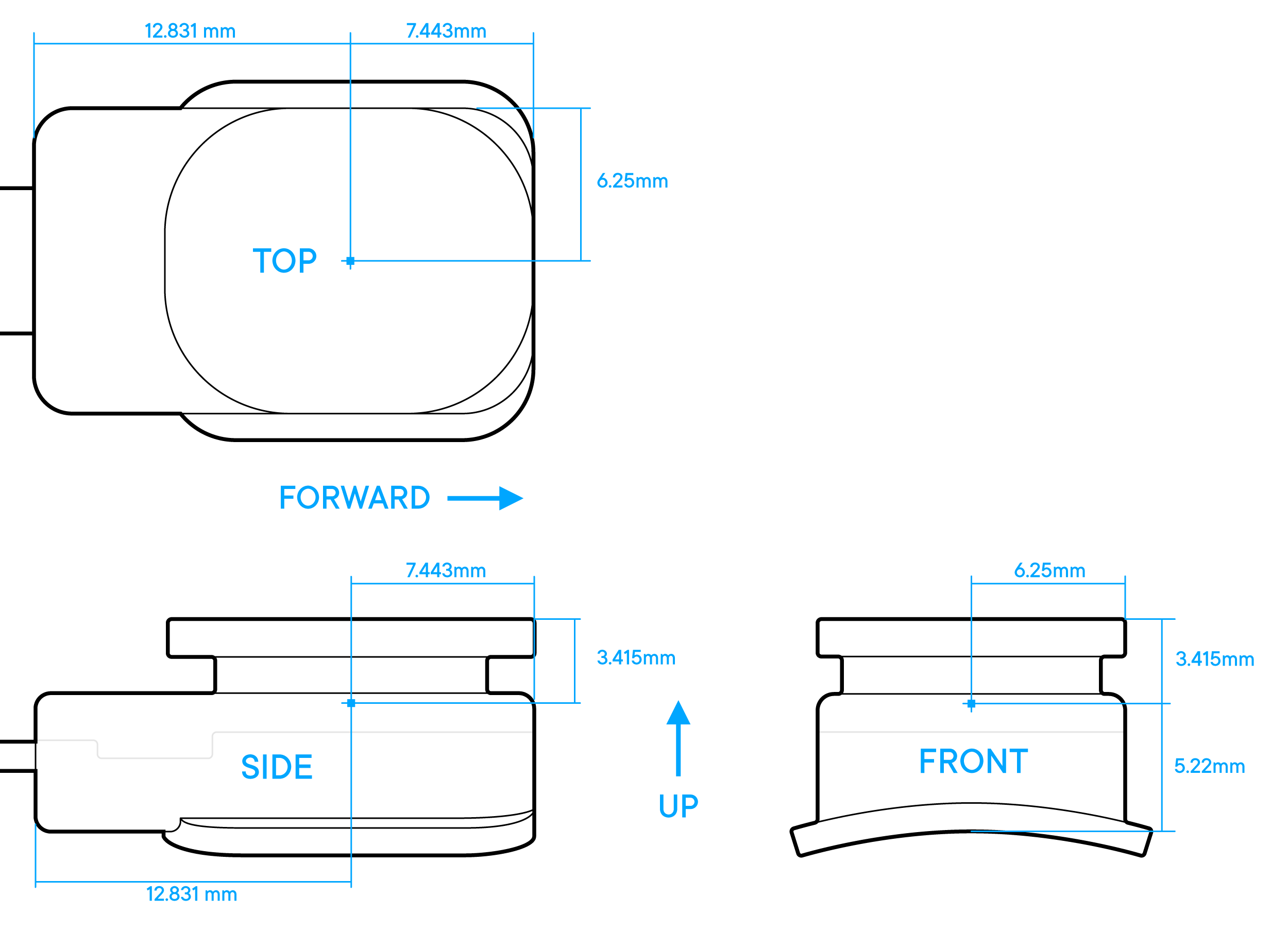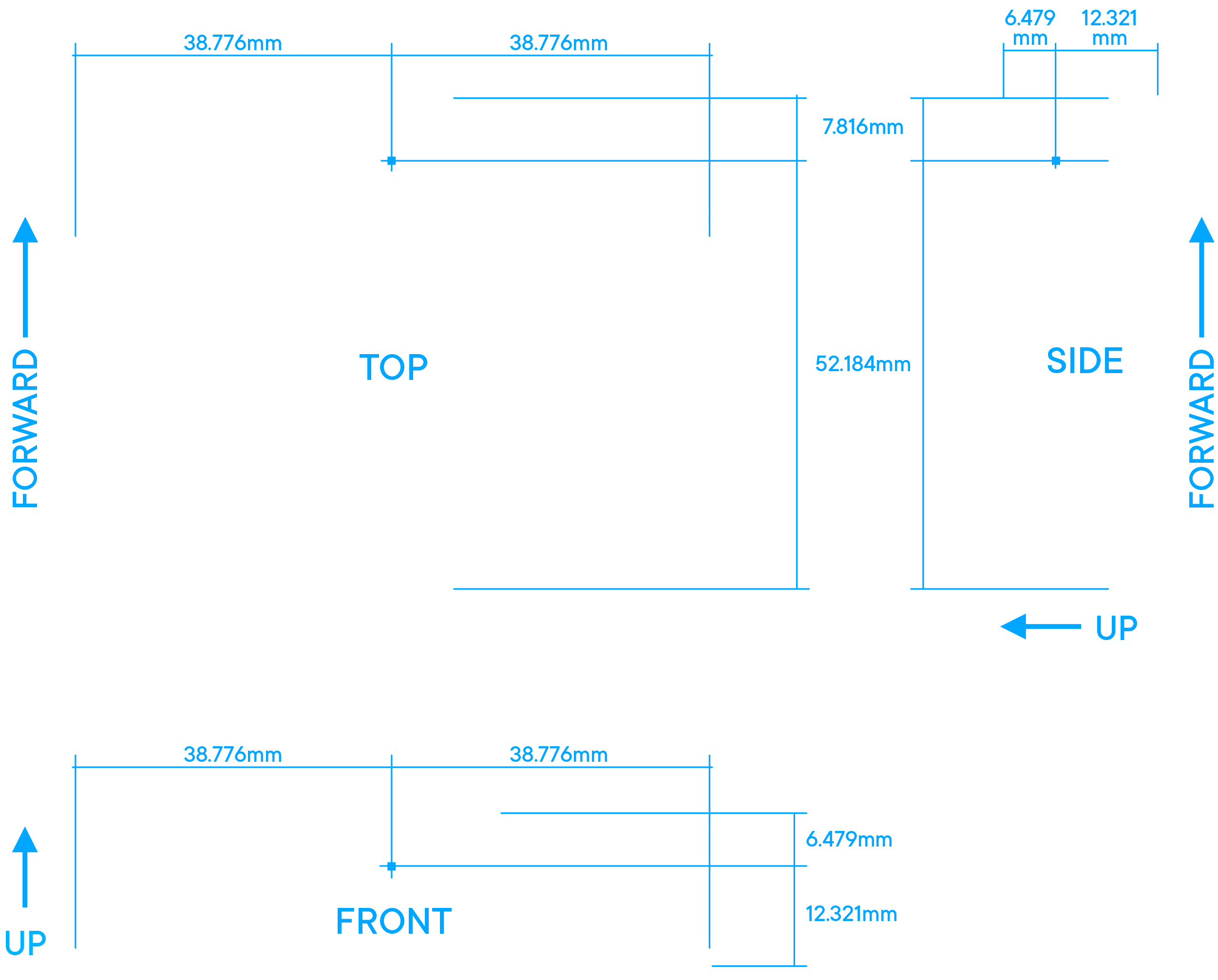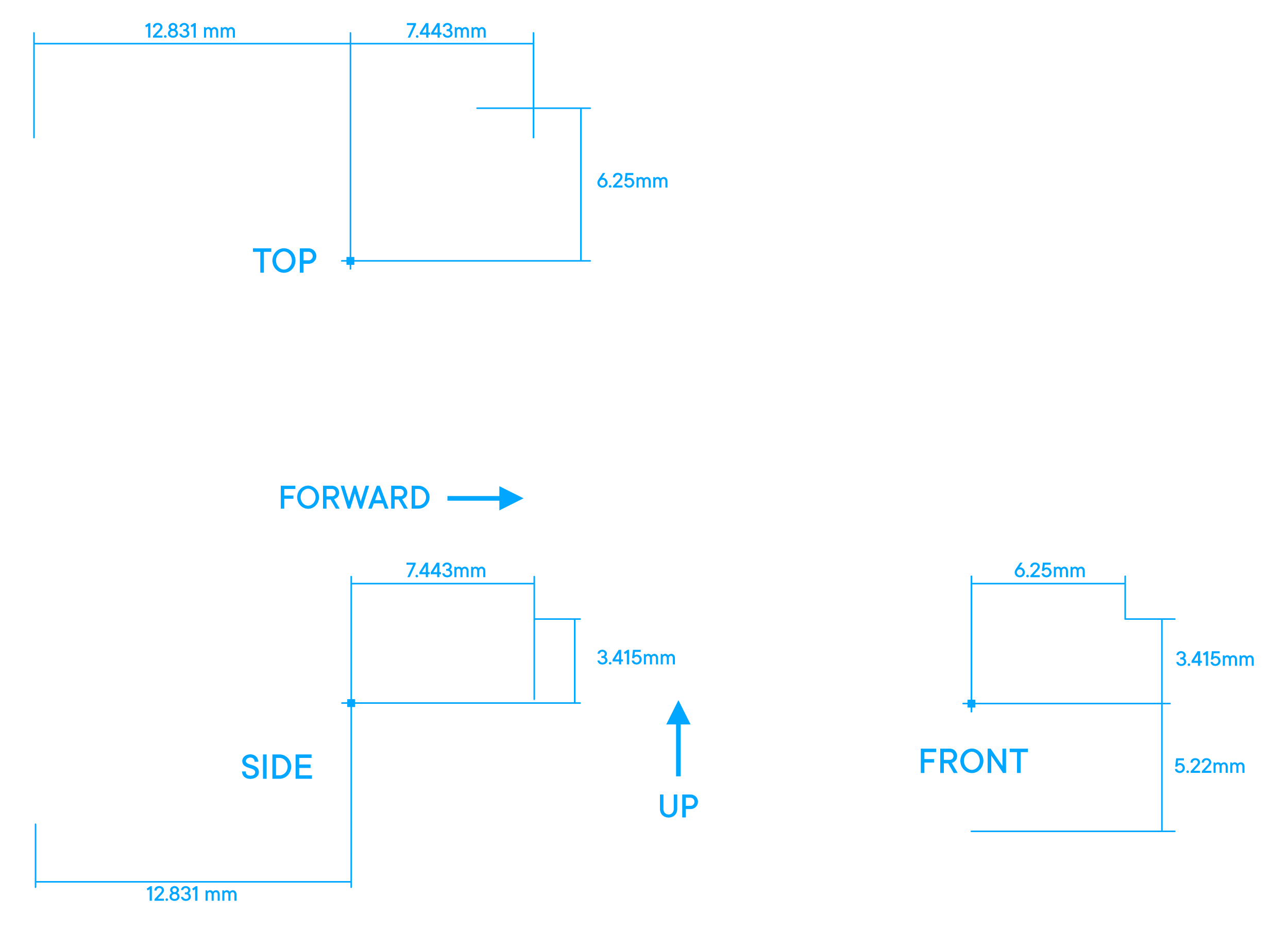 The position of the sensors are relative to the magnetic coils inside the casing on the back of the hand. This means that the offsets from sensor to joints have to be taken into consideration when interpreting the data. See the diagram below for the exact positioning of the coils inside the casings. The sensor positions are measured from finger sensor coil relative to the main coil in the casing.