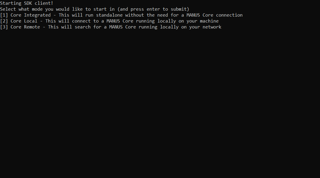 - Core Local mode: The SDK will connect to a MANUS Core running locally on this machine.