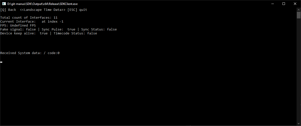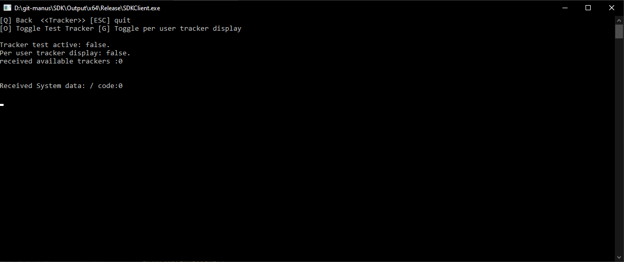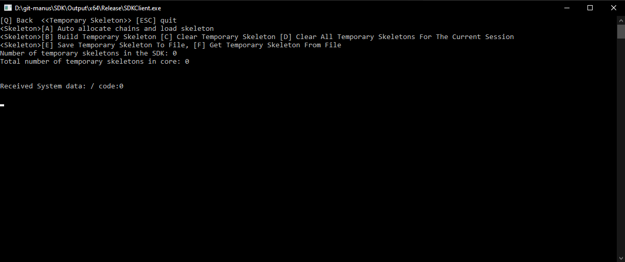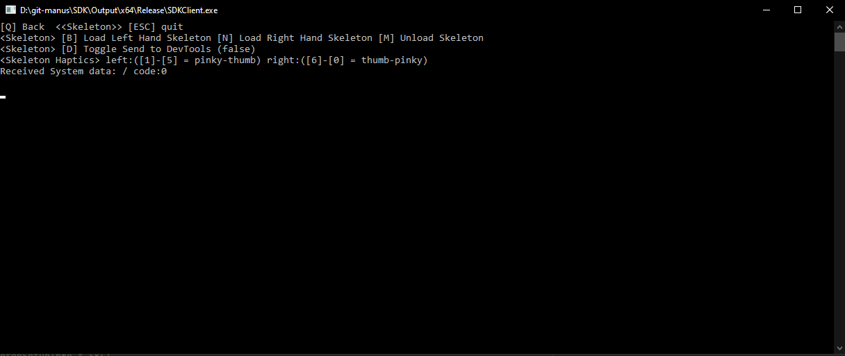 The SDK Client example functions as a demonstration of all major SDK functions. It is a simple console application that shows how to connect to MANUS Core, how to set up the coordinate system and how to handle the landscape, gloves, dongles, skeletons, gestures, trackers and time tracking. The example client is not meant to be a full-fledged application, but rather a demonstration of how to use the SDK functions. The example client is written in C++ and uses the MANUS Core SDK.