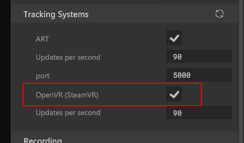 If OpenVR (SteamVR) does not show up here, try and refresh the Tracking Systems by clicking the refresh icon on the top right.