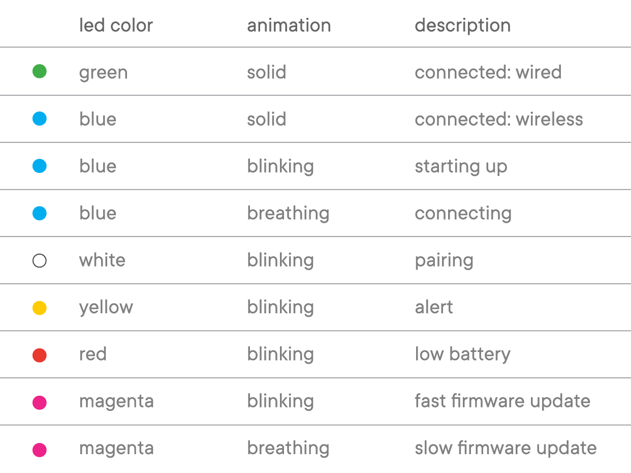 LED Status Your Quantum Metagloves have two LEDs, a Battery LED and a Status LED. Battery LED The Battery LED has 3 modes: Status LED The Status LED has 10 modes: Was this page helpful? Thanks for your feedback! Thanks for your feedback!