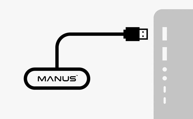 Please insert the Manus Dongle into your computer. This dongle receives glove data and communicates this to Manus Core. One dongle can connect to one pair of gloves.