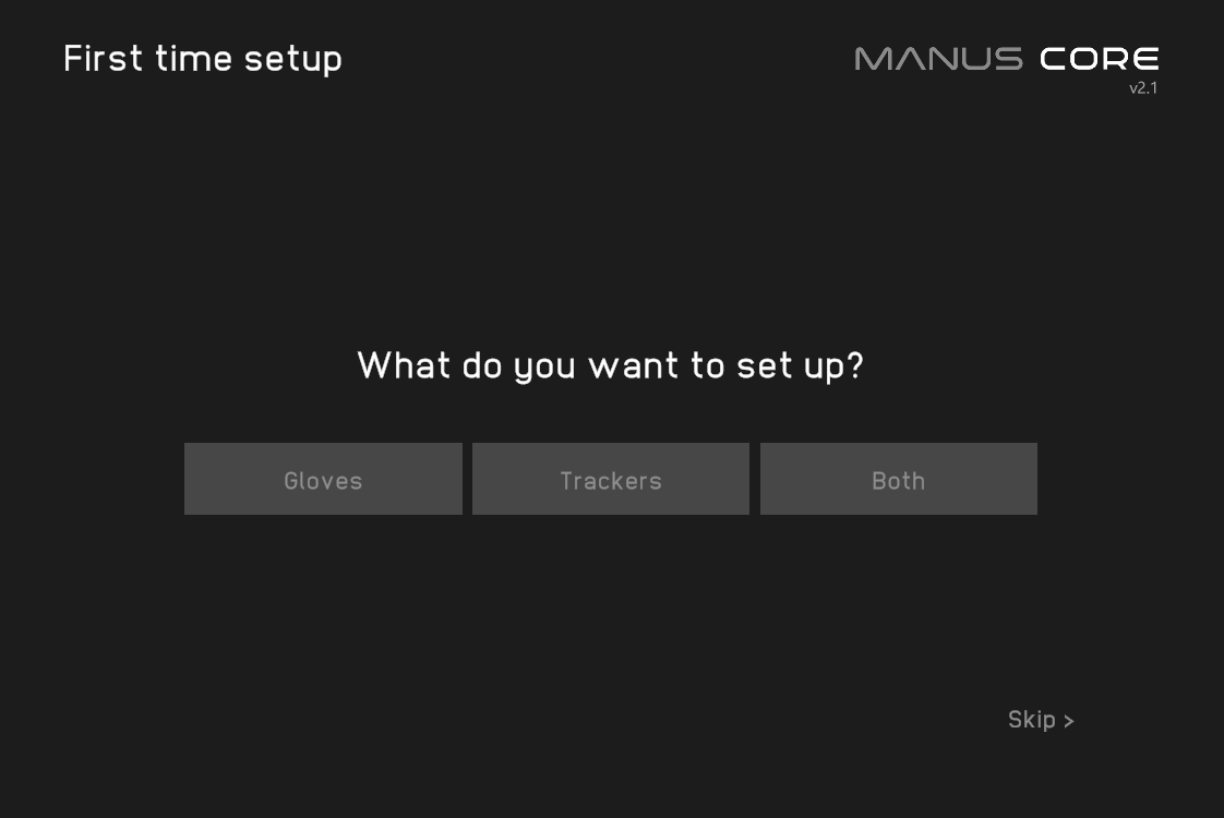 When you start MANUS Core for the first time, it will take you through a first-time setup to configure your devices and create a profile.