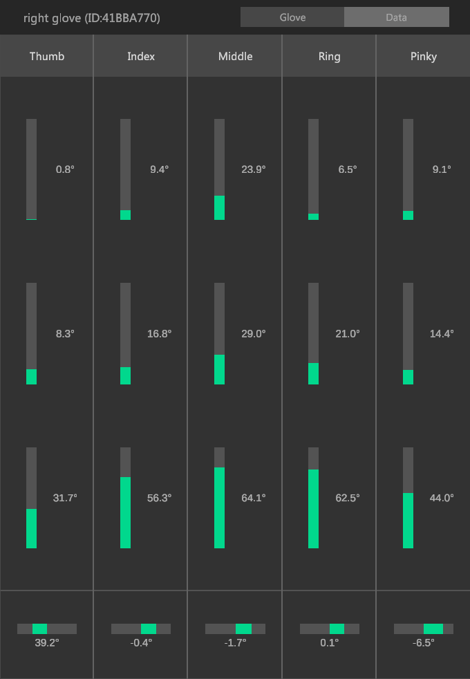 This view allows you to look at the data driving your virtual hands. The top three green bars translate to the rotation of the individual joints in the finger digits. The bottom row translates to the sideways motion of each finger.