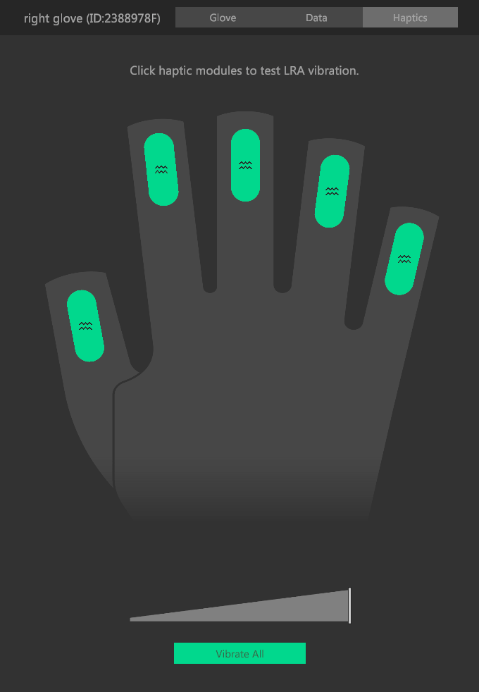 When Prime 3 Haptic XR gloves are used you can use this view to test and visualize all haptics. The slider helps you to set the intensity of the vibrations.