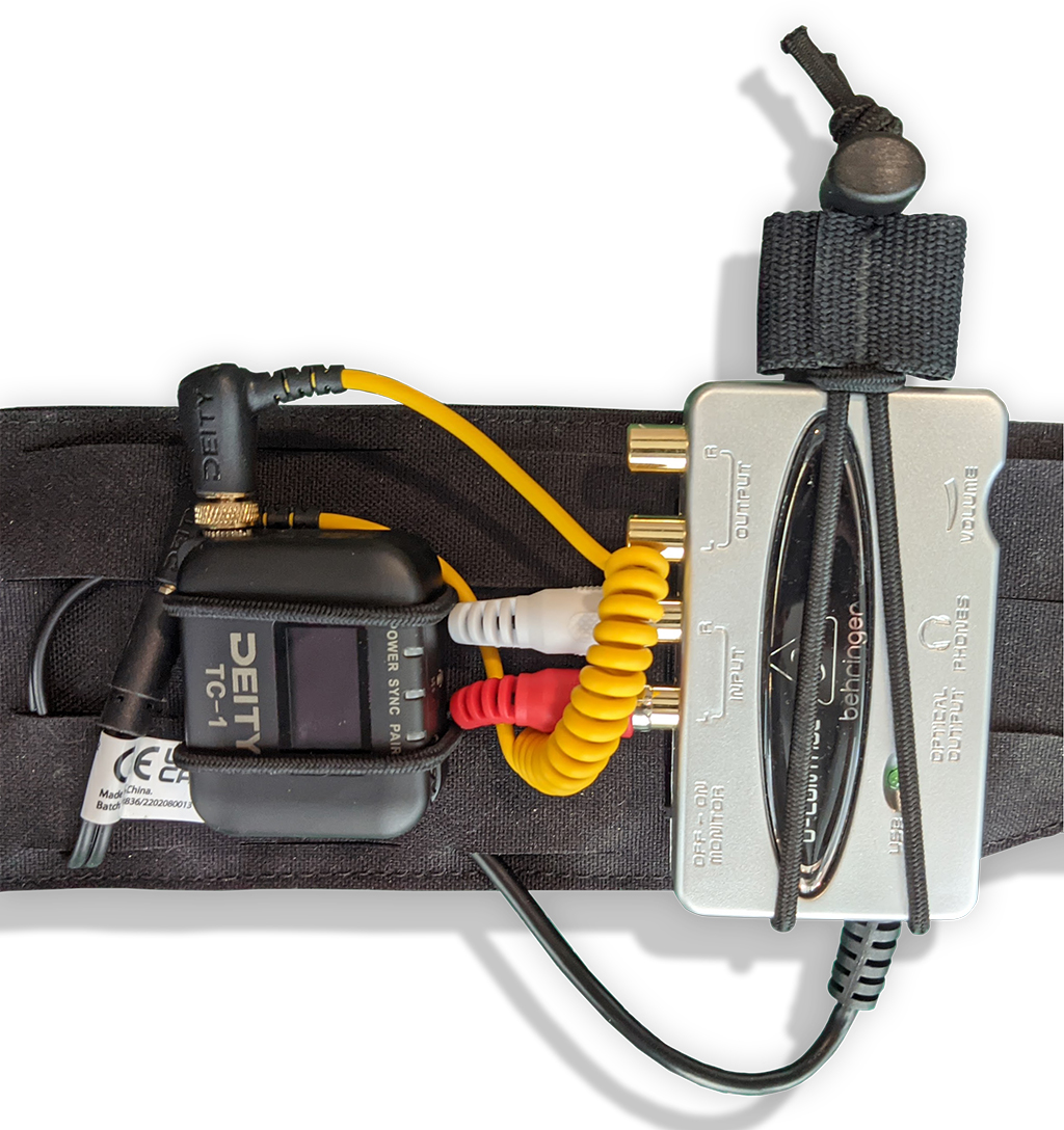 The Bodypack Belt also comes with various elastic bands to attach timecode equipment, including a USB audio interface and timecode generator.