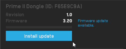 Open MANUS Core Dashboard and plug your dongle into your PC. Once the dongle is connected, it will appear in your devices. When you click on it, a menu will appear in the bottom right corner. There, you have the option to update the dongle. Do not unplug the dongle till the update is finished.