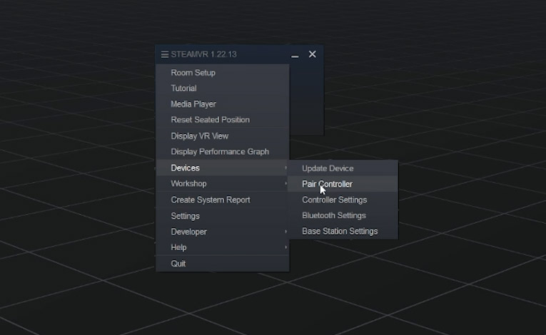 Open the SteamVR Dashboard and navigate to Devices>Pair Controller.