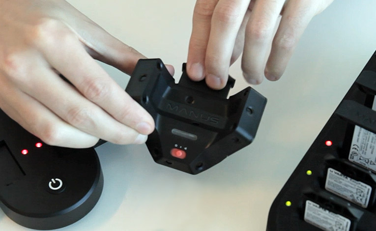 The empty battery can be placed in the Manus Charging Station, which can charge up to 6 batteries simultaneously.