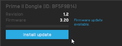 Open MANUS Core Dashboard and plug your dongle into your PC. Once the dongle is connected, it will appear in your devices. When you click on it, a menu will appear in the bottom right corner. There, you have the option to update the dongle. Do not unplug the dongle till the update is finished.