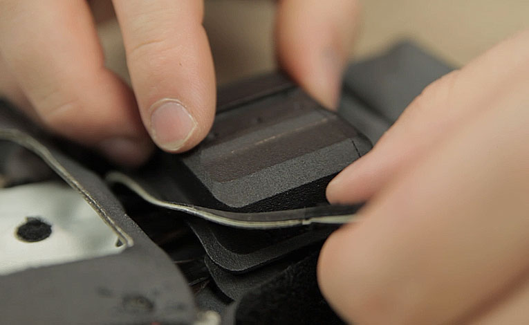 Gently detach the Linear Resonant Actuators (LRA's) and guide them through the opening in the fabric.