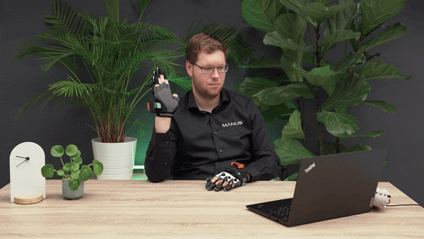 To calibrate the gloves to your hands, use the MANUS Core Dashboard. To calibrate the gloves to your hands, use MANUS Core Dashboard. This process includes 3 poses, with 3 steps per pose. For each pose you will see a preview, then you’ll have time to mimic the pose, and during the last step the pose will be recorded. During the calibration, please mimic the poses in a comfortable fashion.