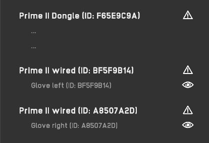 Firmware updates are always rolled out together with new MANUS Core updates. Make sure that your gloves and dongle are always on the same version of the firmware. The need for firmware update is indicated by a triangle with an exclamation mark.