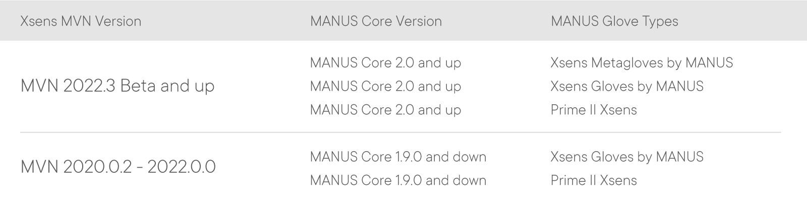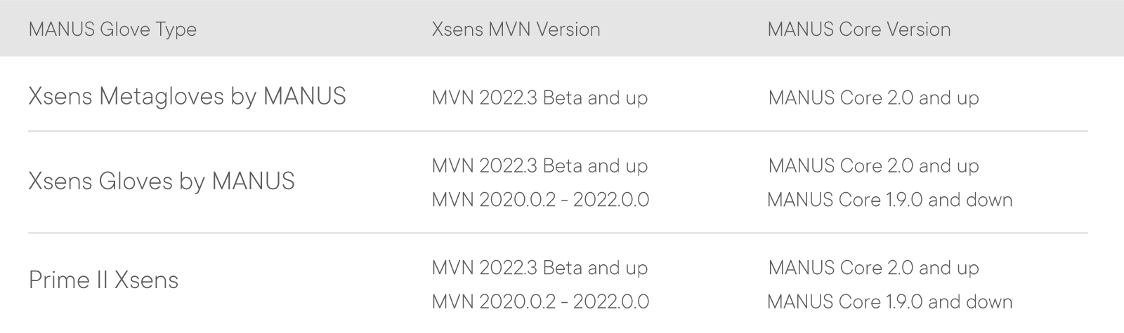 Below you can find an overview of all compatibilities between MANUS gloves, Xsens MVN versions and MANUS Core versions.