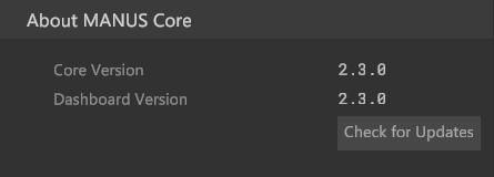 In this panel you can see which version of MANUS Core and its Dashboard you are currently using. You can also manually check for updates of MANUS Core. MANUS Core will regularly check for updates in the background.