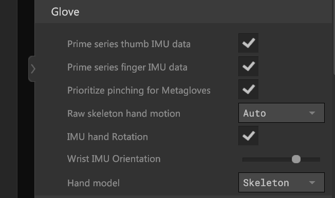 The MANUS Prime II & X Series gloves use 2 kinds of sensors: orientation sensors and bend sensors. When you experience sensor drift, you can decide to disable the orientation sensors. With these settings, you can select to only use the bending sensor data.