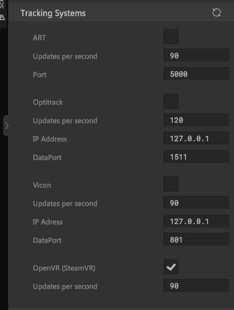 On the right top is a refresh circular button. This forces a rediscovery of tracking systems. Generally handy when your indented tracking system is not showing up in the list below.