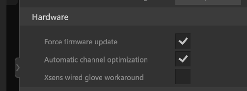 Trigger: Enables remote triggering of a MANUS Core recording when a capture is started in OptiTrack Motive. Please refer to OptiTrack Motive's documentation on how to setup remote triggering in Motive.