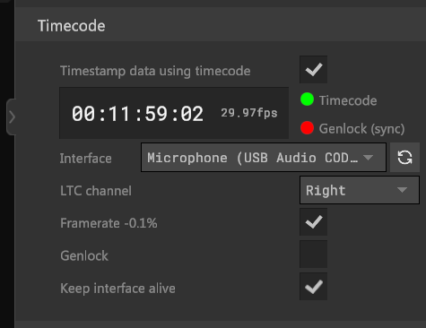 Select the input audio-interface your LTC and Sync/Genlock signal is being sent to. Generally this will be a line-in interface. The left channel will be the Sync/Genlock signal and the right the LTC signal. The button on the right reloads all currently available audio-interfaces.
