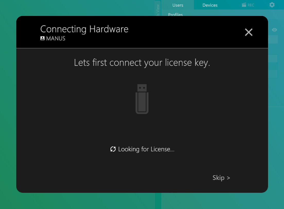 The license key needs to be connected to the computer via USB at all times to enable its features. It's presence is then shown in the devices tab of MANUS Core Dashboard. Its features are then shown in the license section of the Devices tab of MANUS Core Dashboard.