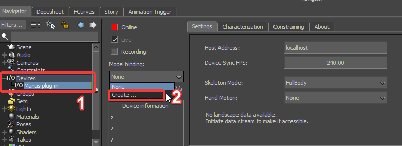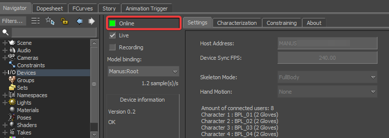 Devicesfolder in theNavigatorpanel and select the "Manus plug-in" device. - Open the